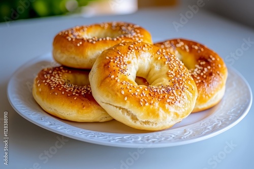 Bagels dorados espolvoreados con semillas de sésamo, servidos en un plato blanco sobre fondo claro.