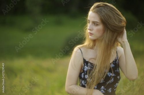 beautiful young blonde with long flowing hair on a blurred background of summer greenery