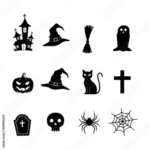 Black Halloween Silhouette Icons Featuring a Haunted House, Witch Hats, Broom, Ghost, Pumpkin, Cat, Cross, Tombstone, Skull, Spider, and Spiderweb for Festive and Spooky Design