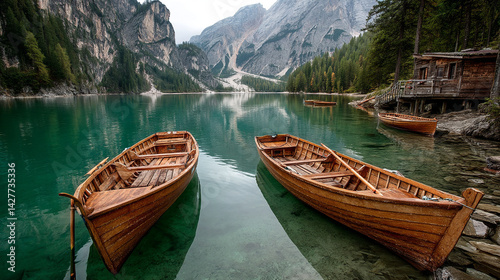 Boats Float on Calm Turquoise Lake Surrounded by Majestic Mountains at Dawn boats on the lake