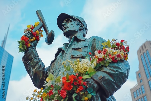 Bronze statue of a worker holding a hammer, decorated with colorful flowers, standing against a city skyline, symbolizing labor and tribute.