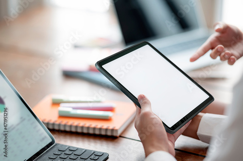 hand, hand, cropped, closeup, holding, tablet, device, notebook, computer, mobile, portable, screen, blank, white, empty, mock, montage, business, businessperson, people, businessman, background, concept, template, design, analysis, analysing, discussing, discussion, calculating, calculate, meeting, indoor, office, modern, technology, communication, cyberspace, online, laptop, workspace, workplace, strategy, planning, display