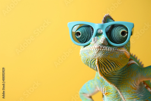 chameleon wearing sunglasses and standing on a yellow background. Scene is lighthearted and fun