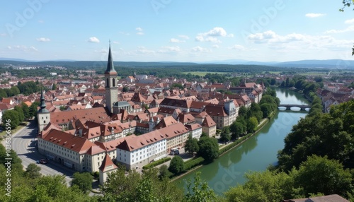 architecture, green, sky, cloud, river, historic, bridge, day, sunlight, blue, aerial, town, european, view, landscape, skyline, urban, building, city landscape, tree