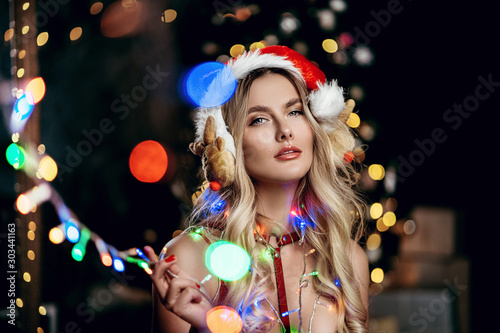 Christmas woman. Beauty model girl in santa claus hat with red lips and appropriate manicure. Posing in red lingerie in a garland on the background of a Christmas tree. Background with place for text