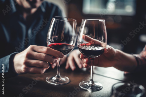 Close up of young friends toasting with glasses of red wine at restaurant. Generative AI.