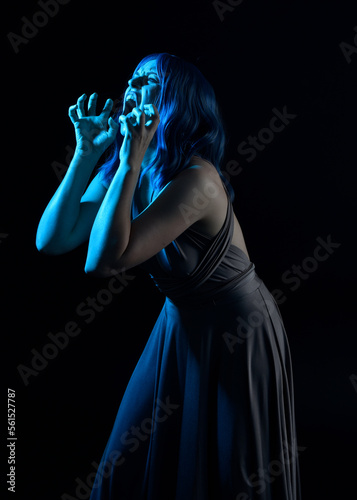 close up portrait of pretty girl with blue hair wig & elegant gown with expressive facial expressions & gestural arm poses. colourful neon gel lighting, isolated on studio background.
