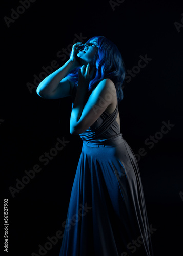 close up portrait of pretty girl with blue hair wig & elegant gown with expressive facial expressions & gestural arm poses. colourful neon gel lighting, isolated on studio background.