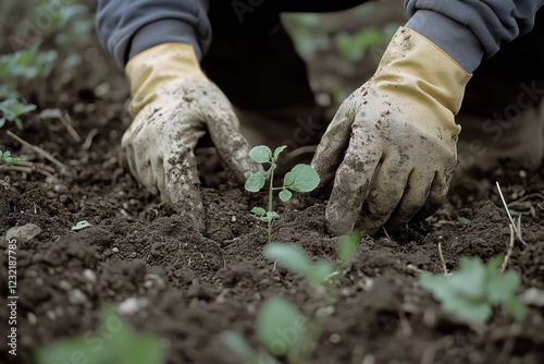 hand, dirtied, planting, germ bud, glove, nature, agriculture, earth, growth, horticulture, green, environment, outdoors, cultivation, farming, nurture, care, spring, garden, sustainability, organic, landscape, botany, flora, manual, work, hobby, lifestyle, environmentally friendly