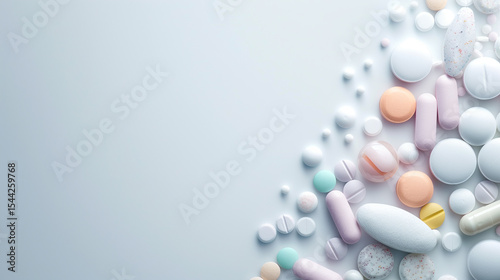 Close-up studio shot of colorful pills and capsules on white background