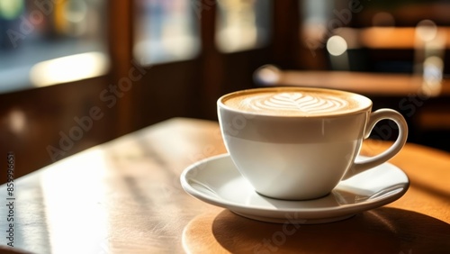 cup, latte, foam, afternoon, art, cappuccino, warm, cosy, sunlight, saucer, morning, hot drink, interior, table, ambience, relaxation, drink, wooden, beverage, cafes