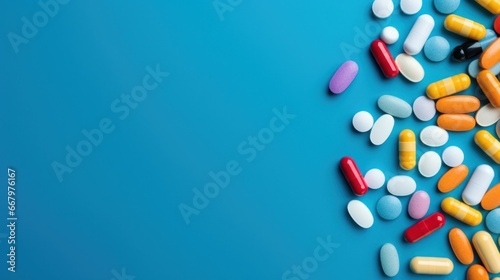 Colorful medicine tablets antibiotic pills on light blue background, copy space
