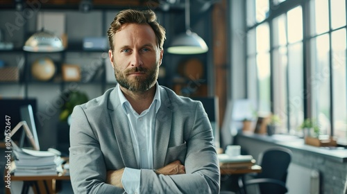 confident, businessman, leaning, desk, office, interior, professional, head shot, caucasian, male, suit, attaching, corporate, finance, leadership, success, determined, ambitious, growth, strategy, communication, trust, power, authority, modern, clean, business, meeting, presentation, paperwork, laptop, computer, negotiation, deal, closing, skyscraper, urban, city view, highrise, window, city landscape, architecture, panoramic, potential, opportunity, achievement