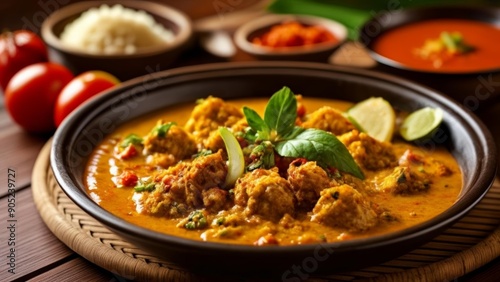 garnish, accessing, food, dining, appetising, bowl, rice, basil, aromatic, curry, colourful, delicious, exotic, lime, meatball, meal, spice, savoury, wooden table, sauce