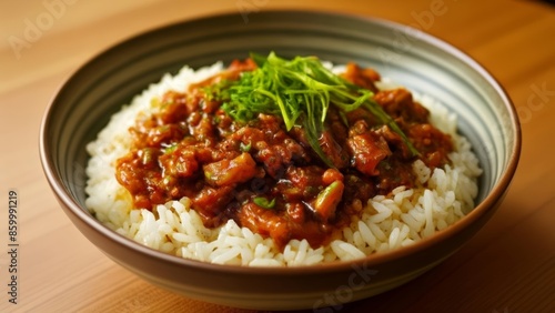 bowl, green, accessing, red, cookery, appetising, stew, dinner, meal, food, table, sauce, wooden, garnish, rice, beef, dish, savoury, delicious