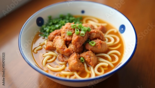 inviting, asian cuisine, home cooking, broth, garnish, delicious, mouth-watering, noodle, soup bowl, table setting, lunch, appetising, dinner, comfort food, food, wooden table, soup, green onion, meatball, meal