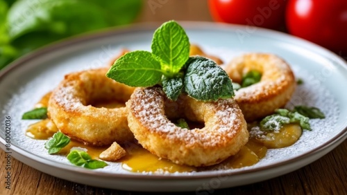 powdered sugar, dessert, presentation, mint, maple syrup, indulgence, gastronomy, enticing, culinary, appetising, culinary arts, plate, fried, glaze, mouth-watering, food photography, donut, delectable, food, table, pastry, garnish, dish, sweet, epicure
