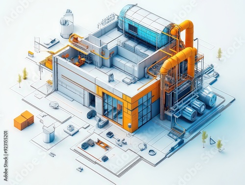 detailed 3D model of an industrial factory with pipes, machinery, and modern infrastructure