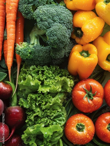 different vegetables, using green and paletted yellow panels, lettuce in the foreground, broccoli and beets in the background, peppers, carrots in the background, tomatoes in the lower right corner,