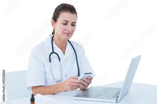 mature adult, woman, female, caucasian, doctor, practitioner, stethoscope, medicals, labcoat, specialist, health care, desk, working, sitting, computer, using, typing, laptop, notebook, technology, wireless, concentrated, thoughtful, serious, focused, concentrating, smartphone, mobile phone, wireless technology, phone, holding, showing, screen, touching, white background