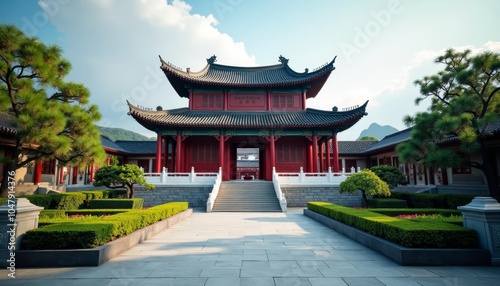 white cloud, garden path, tourist attraction, stone wall, historical site, blue skies, pagoda