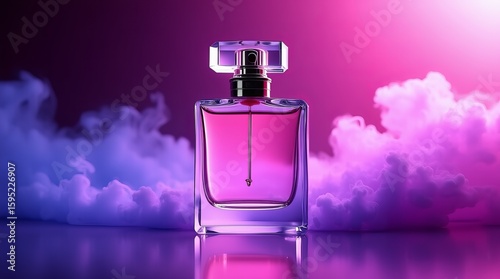 elegant purple perfume bottle on dreamy pink and violet fog background