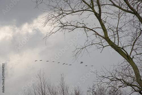 Flock of Canada geese in flight over bare trees on a cloudy day, low angle view - branta canadensis