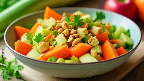 salad, kitchen, vegetable, meal, dinner, nut, alimentary, bowl, table, fresh, food, chopped, healthy, apple, lunch, garnish, colourful, celery, carrot, salad dressing