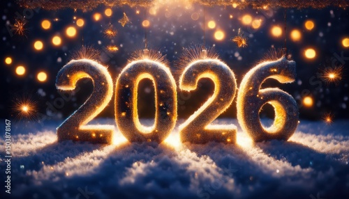 glowing 2026 numbers in frosty snow with golden lights and bokeh for new year web design, print poster, holiday branding, winter celebration, or festive greeting background