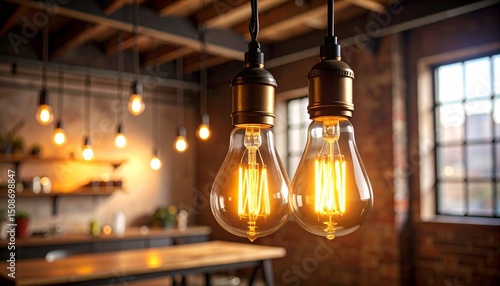 glowing Edison-style bulb hanging from ceiling in industrial setting