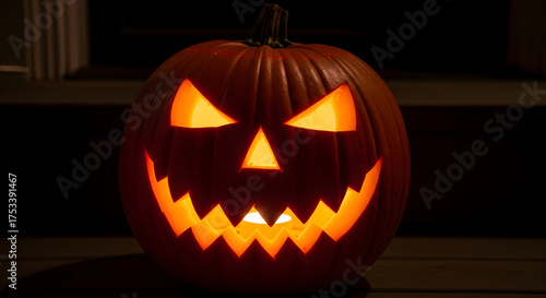 "Glowing Jack‑o'Lantern With Green Vines — Carved Smiling Pumpkin Surrounded by Lush Pumpkin Leaves on Wooden Plank"