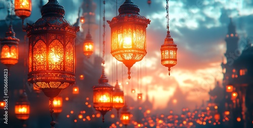 Glowing Lanterns Against Twilight Sky Over Urban Landscape