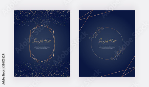Gold confetti on the dark blue background with polygonal lines frame. Modern vector design for wedding invitation, greeting, banner, flyer, poster, save the date
