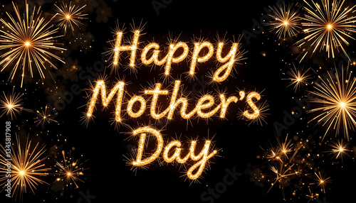 Gold Sparkler Firework Text with Happy Mothers Day Caption on Black. Celebration Banner with copy space on a black background.