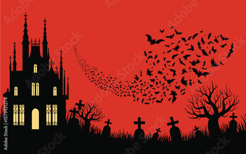 Halloween Design Background with Graveyard, Bare Trees, Graves, and Bats Ideal for Seasonal Invitations, Posters, Party Flyers, Digital Graphics, and Copyspace Layouts