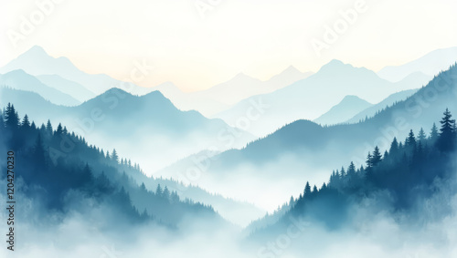 Hand-painted watercolor Misty Mountains, representing mysterious beauty
