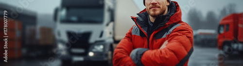 driver, clothing, truck, rainy, warehouse, cargo, trailer, loading, hauler, safety, job, occupation, male, men at work, autumn, cold, night, jacket, beanie, rain, supply, distribution, haulage, import, fog, head, lamp, industrial, parking, operation, confident, logistic, transportation, delivery, freight, industry, shipping, outdoors, wet, professional, transport, commercial, vehicle, work, business, road, car, man, service