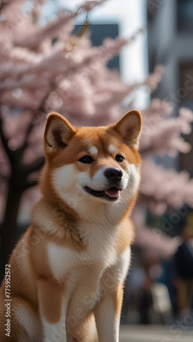 happy shiba inu dog sitting on a paved path surrounded by blooming cherry blossom trees