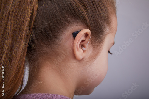 Hearing Aid in Young Girl's Ear. Toddler girl wearing a hearing aid. Studio shot