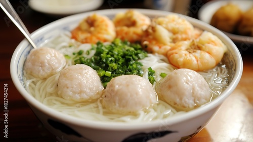 In the bowl, there are rice noodles with shrimp and meatballs in clear broth