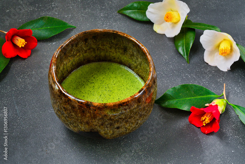 日本の茶道 茶碗と抹茶と美しい椿  コピースペースあり Japanese Tea Ceremony (Chado) : Tea bowl, matcha (green tea) and beautiful camellia, copy space available