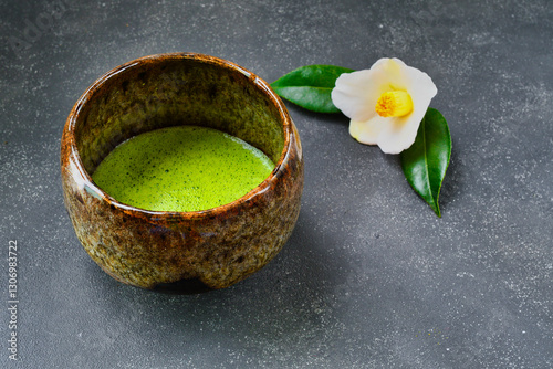 日本の茶道 茶碗と抹茶と美しい椿 日本のイメージ コピースペースあり Japanese Tea Ceremony (Chado) : Tea bowl, matcha (green tea) and beautiful camellia, Image of Japan, copy space available