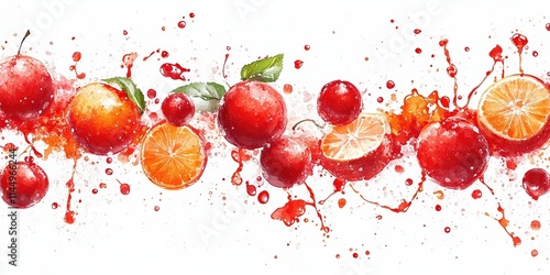 Juicy red fruits like cherries and oranges bursting with vibrant splashes of juice on white background, representing energy, vitality, and fresh natural flavors in artistic presentation.