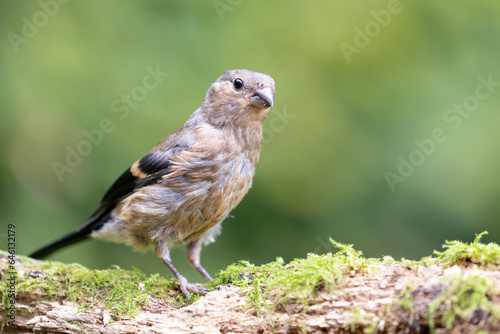 Juvenile Eurasian Bullfinch (Pyrrhula pyrrhula) perched on a branch with green foliage background - Yorkshire, UK in