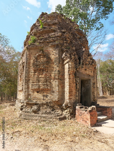 Kampong Thom, Cambodia-January 25, 2020: Flying palace relief on the wall of Sambor Prei Kuk or Prasat Sambor N7 in Kampong Thom, Cambodia