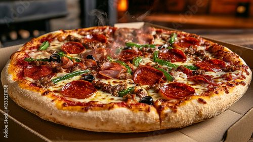 large 16 slice pizza with Marinara, Onions, Green Peppers, Pepperoni, Salami, Canadian Bacon, Mushrooms, Italian Sausage, Black Olives, Mozzarella toppings being lifted from a box