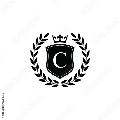 Letter C laurel wreath template logo Luxury shield letter with crown. Monogram alphabet . Beautiful royal initials letter.