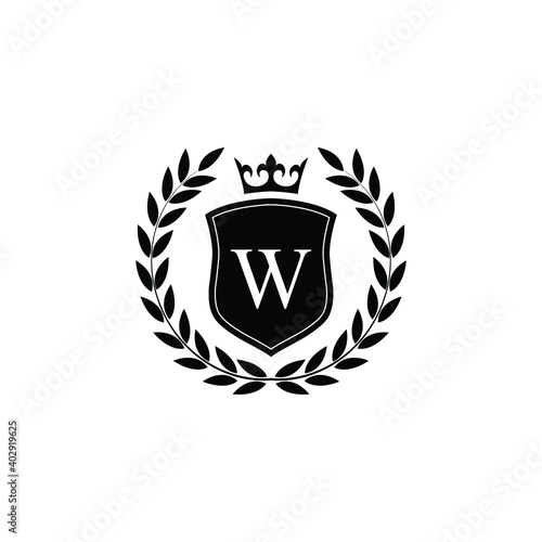 Letter W laurel wreath template logo Luxury shield letter with crown. Monogram alphabet . Beautiful royal initials letter.