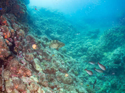 クエ, Longtooth grouper, Epinephelus bruneus, ハタ科, ウミカラマツ, Antipathes japonica, ウミカラマツ科, アカトゲトサカ, トゲトサカ, Dendronephthya, チヂミトサカ科, ウミトサカ, Alcyonacea, ウミトサカ科, ソフトコーラル, Soft Coral, 他の群れ。 静岡県伊豆半島南伊豆町中木ヒリゾ浜