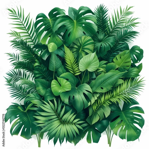 "Lush Green Tropics with a Variety of Leaves Including Monstera and Ferns, Showcasing a Rich and Dynamic Botanical Scene. Color gradient, ombre. Colorful, multicolor, mix, iridescent, bright, fun. Ro
